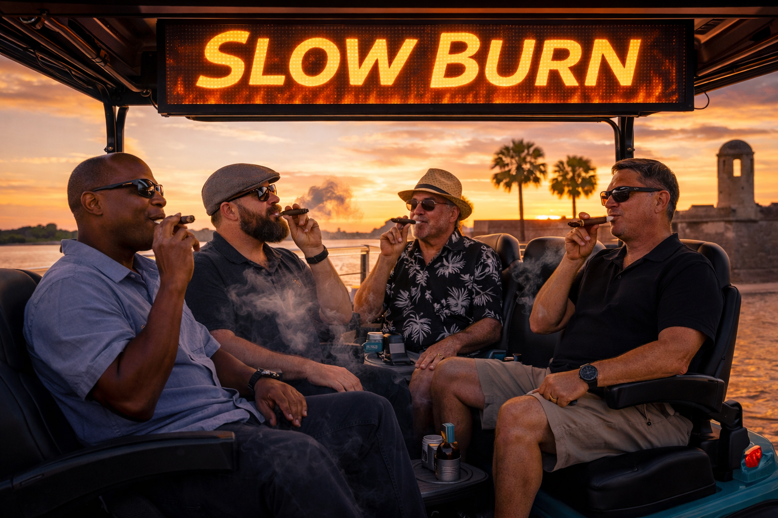 Unwind, cruise, and enjoy a premium cigar experience unlike anything else in St. Augustine, FL. The Slow Burn Cigar Tour is a private 90-minute ride through the downtown corridor designed for those who appreciate good conversation, smooth cigars, and a relaxed atmosphere.
